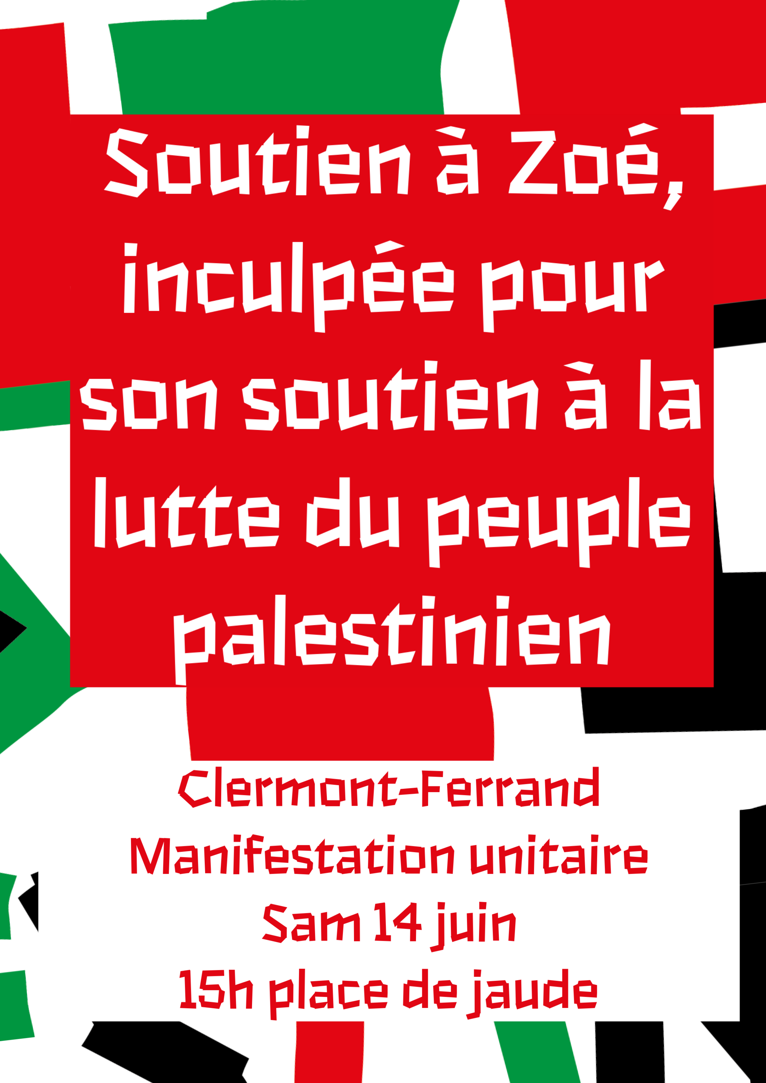 Le collectif 63 de 34 organisations « pour une paix juste et durable » apporte son soutien à Zoé. Le collectif mettra tout en œuvre pour obtenir sa relaxe.