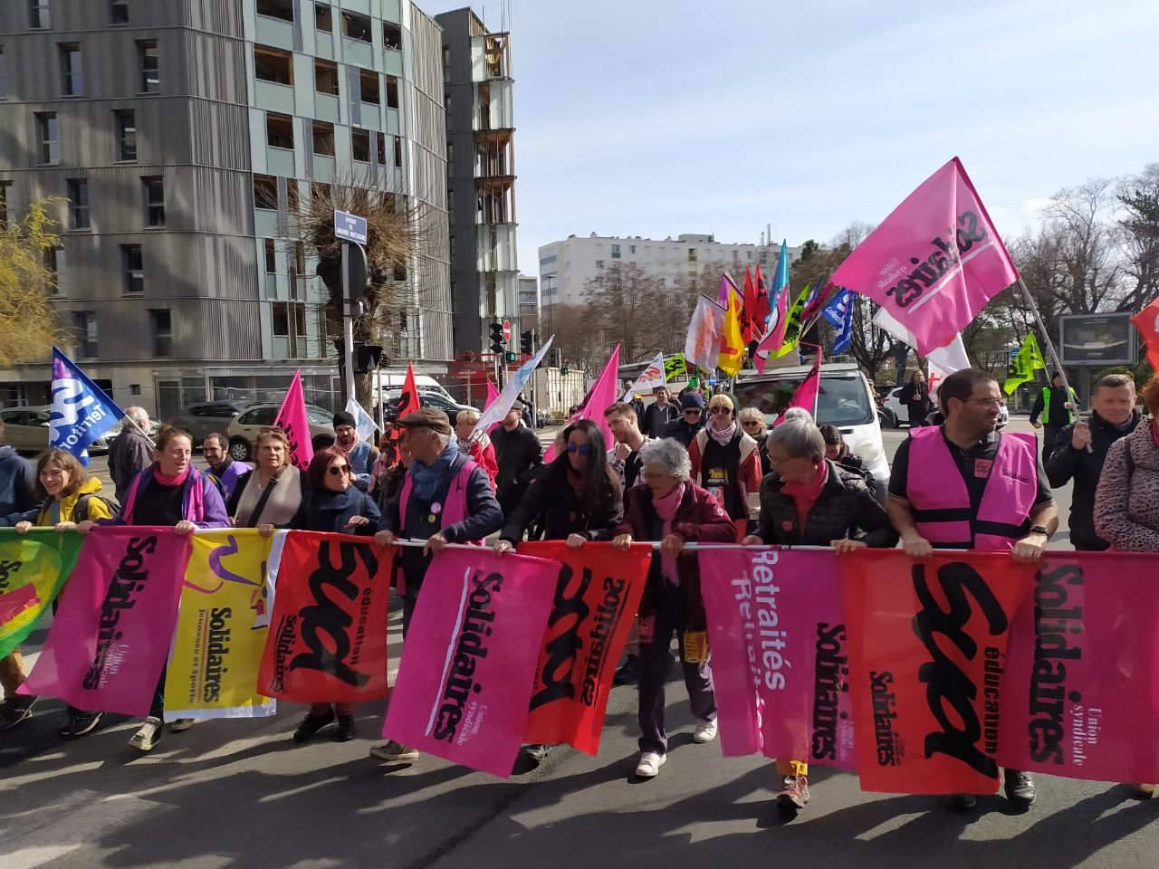 Le gouvernement, mis en difficulté par la mobilisation historique insufflé par l'intersyndicale, a déclenché le 49-3 pour faire passer en force son projet de loi de réforme des retraites injuste et brutale. Depuis l'annonce du 49.3, Solidaires n'a pas chômé : nous avons organisé un rassemblement le soir même qui a réuni 2500 personnes, puis nous avons soutenu une initiative des personnels educ nat de St Jacques appelant à un rassemblement tous les soirs à 18h devant la préfecture. Vendredi nous étions 60, samedi nous étions 700 (et l'après-midi des militant-es de Solidaires ont distribué plus de 1000 tracts à la Pardieu), hier soir nous étions 200.