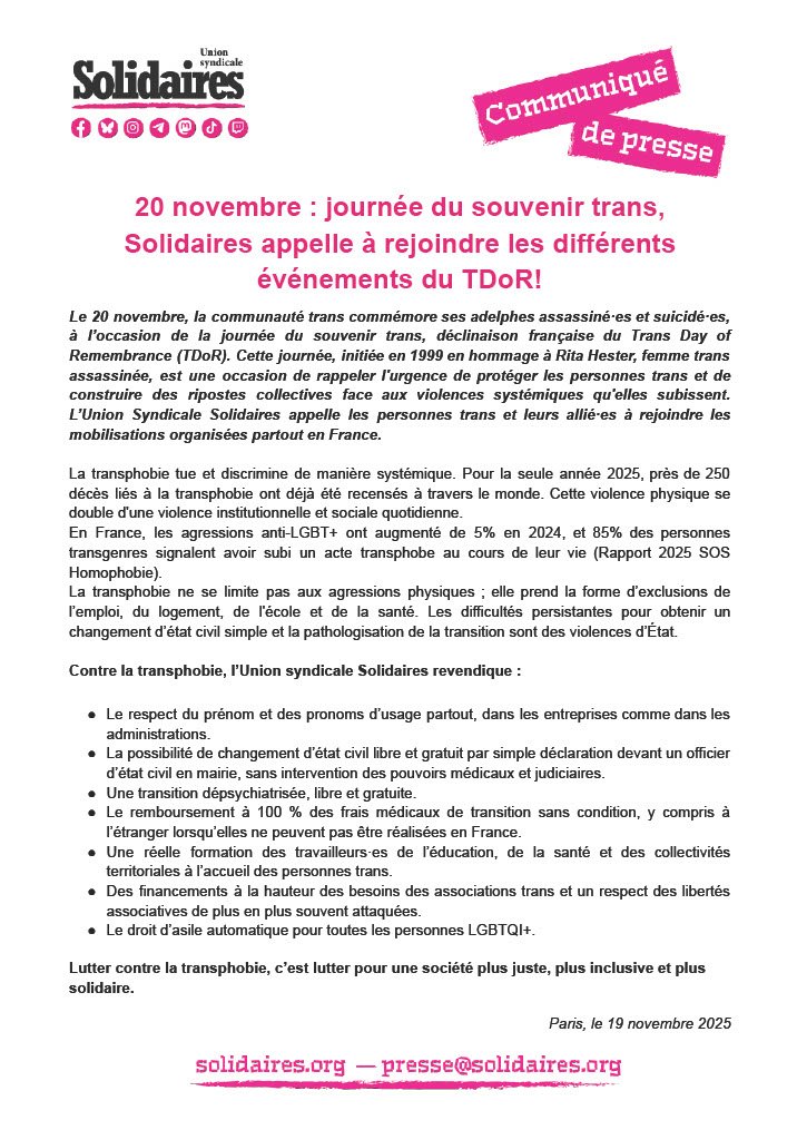 Le 20 novembre, la communauté trans commémore ses adelphes assassiné·es et suicidé·es, à l’occasion de la journée du souvenir trans, déclinaison française du Trans Day of Remembrance (TDoR). Cette journée, initiée en 1999 en hommage à Rita Hester, femme trans assassinée, est une occasion de rappeler l'urgence de protéger les personnes trans et de construire des ripostes collectives face aux violences systémiques qu'elles subissent. L’Union Syndicale Solidaires appelle les personnes trans et leurs allié·es à rejoindre les mobilisations organisées partout en France.