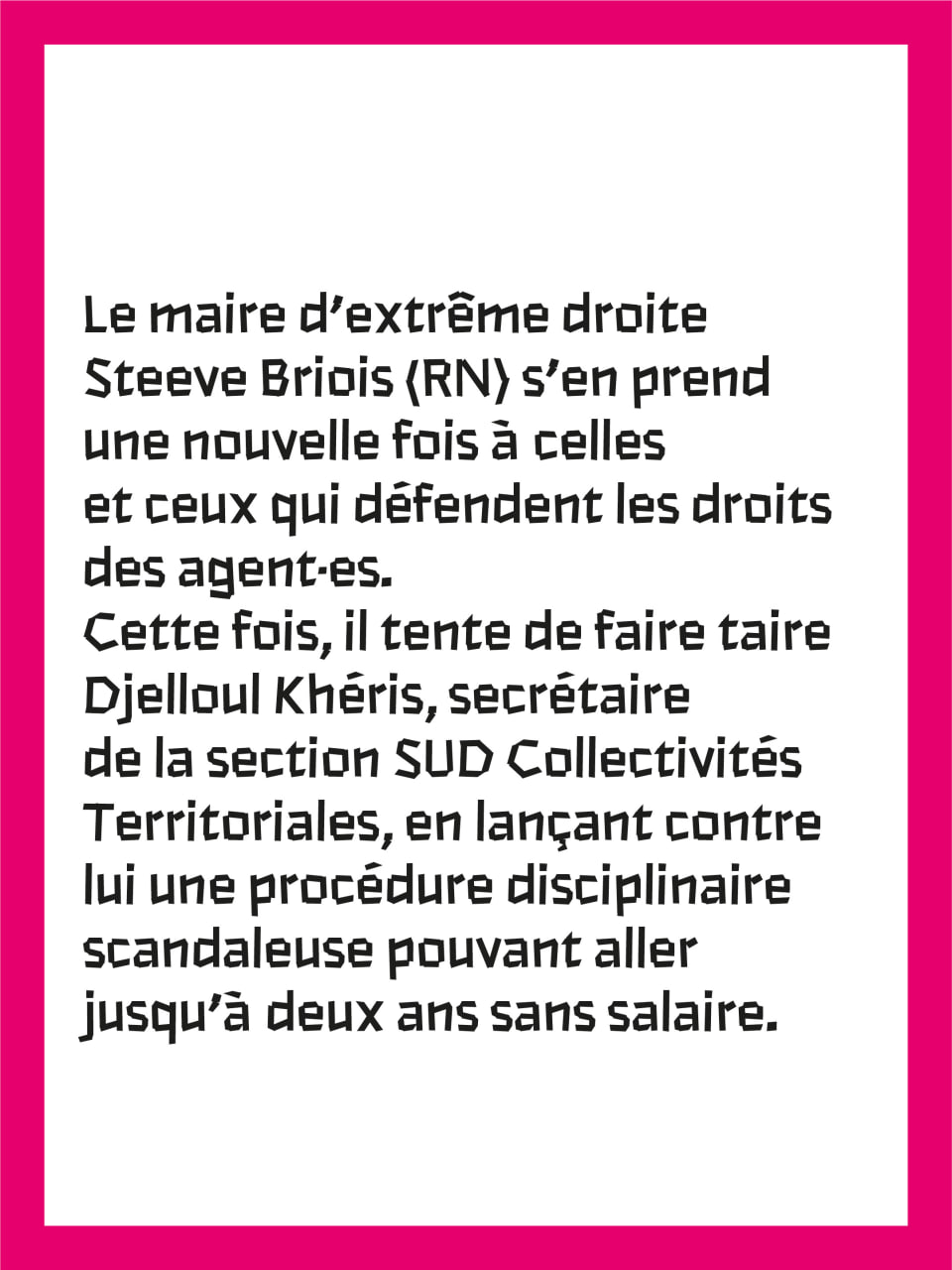 Cette fois, il tente de faire taire Djelloul Khéris, secrétaire de la section SUD Collectivités Territoriales, en lançant contre lui une procédure disciplinaire scandaleuse pouvant aller jusqu’à deux ans sans salaire.