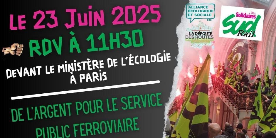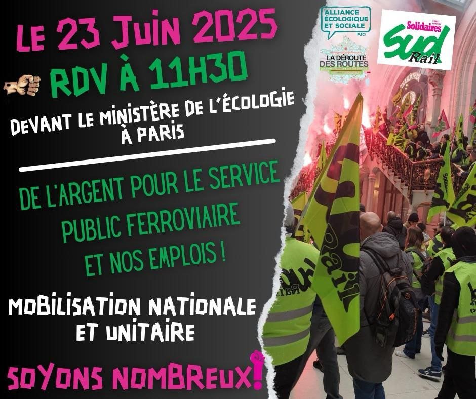 Le 5 mai 2025, le gouvernement a lancé une conférence sur le financement des transports : Ambition France Transports. Le 23 juin, à l’occasion d’une des tables rondes de cette conférence, l’intersyndicale cheminote CGT-UNSA-SUD Rail-CFDT organise un rassemblement avec montée nationale, auquel se joignent l’Alliance écologique et sociale (AES - ex-collectif Plus Jamais ça !) et la Déroute des routes dans le cadre de leur campagne Moins de routes, plus de trains !