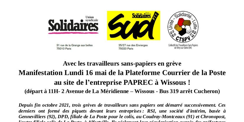 Avec les travailleurs sans-papiers en grève - Manifestation Lundi 16 mai de la Plateforme Courrier de la Poste au site de l’entreprise PAPREC à Wissous !