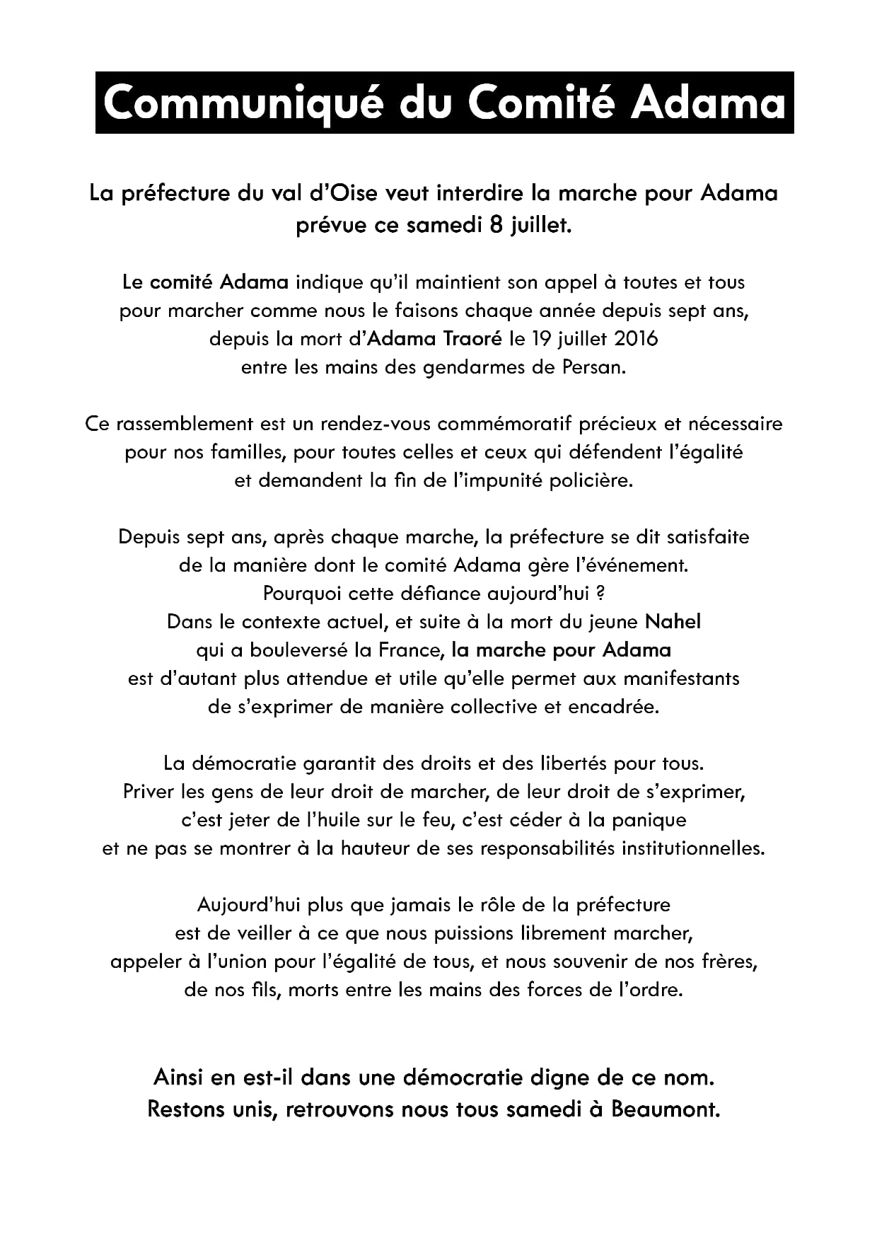 Comité Justice et Vérité pour Adama - La préfecture du Val d'Oise veut interdire la marche pour Adama prévue ce samedi 8 juillet