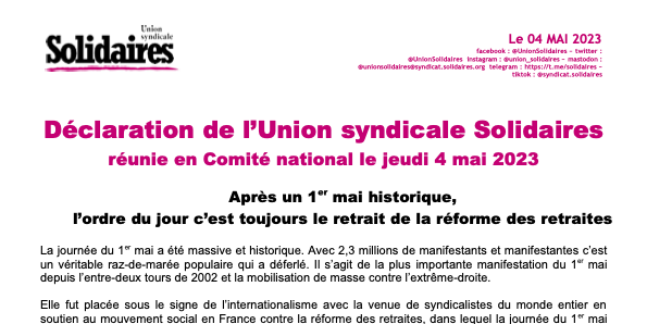 Déclaration de l’Union syndicale Solidaires réunie en Comité national le jeudi 4 mai 2023