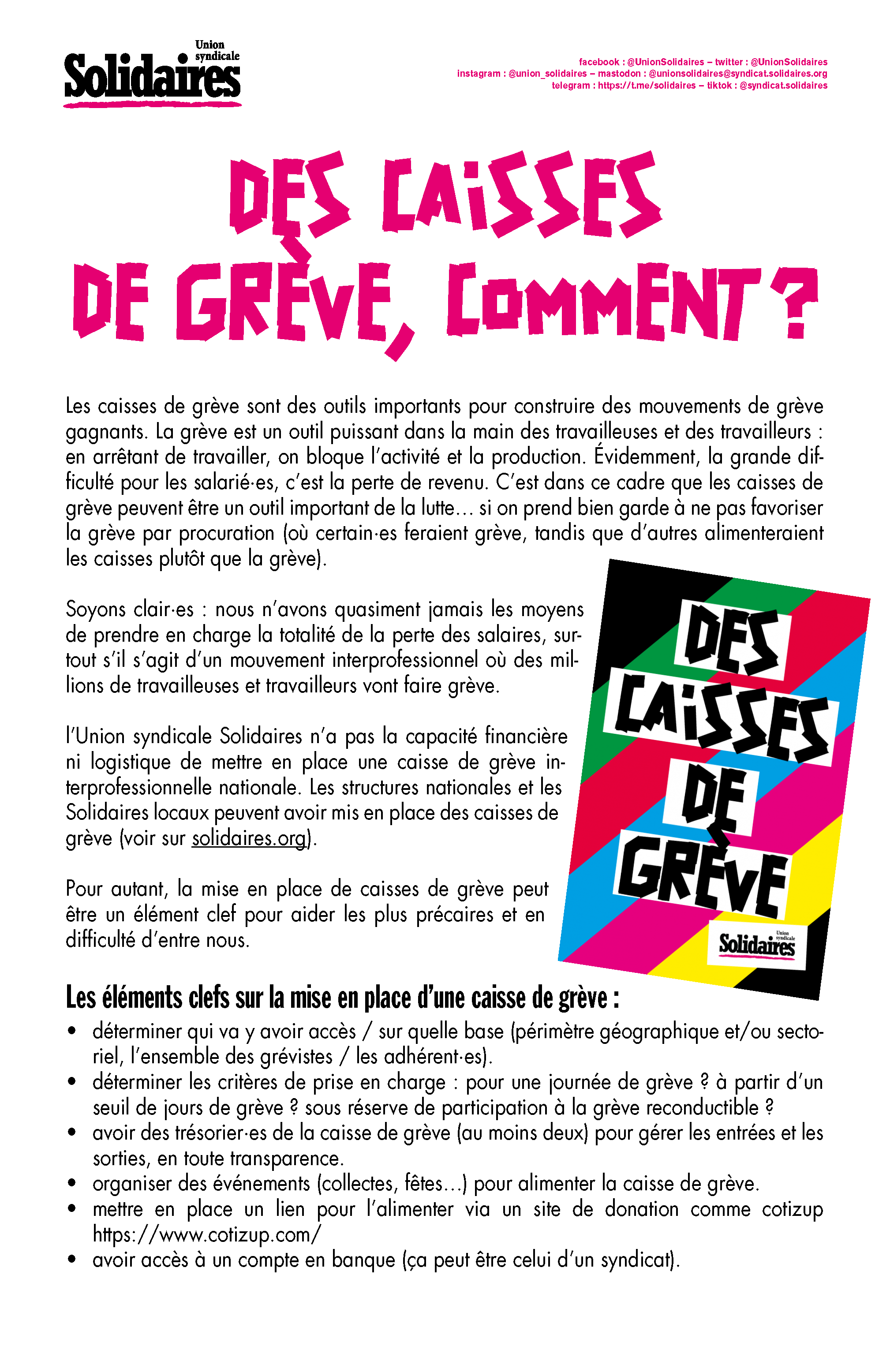 l’Union syndicale Solidaires n’a pas la capacité financière ni logistique de mettre en place une caisse de grève interprofessionnelle nationale. Les structures nationales et les solidaires locaux peuvent avoir mis en place des caisses de grève (lien recensement).