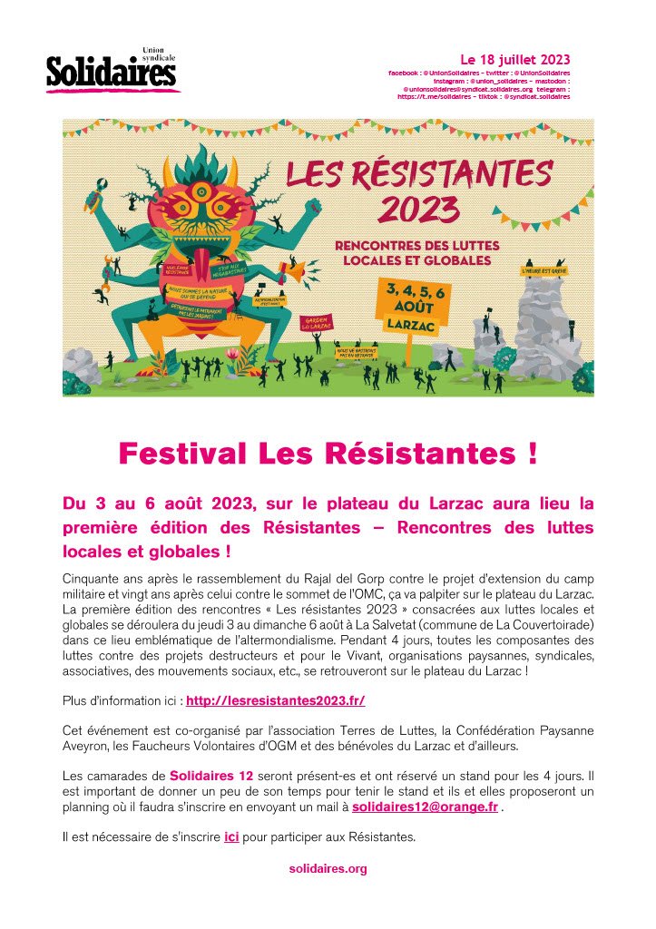 Les camarades de Solidaires 12 seront présent-es et ont réservé un stand pour les 4 jours. Il est important de donner un peu de son temps pour tenir le stand et ils et elles proposeront un planning où il faudra s’inscrire en envoyant un mail à solidaires12@orange.fr .