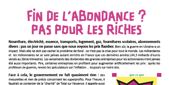 Nourriture, électricité, essence, transports, logement, gaz, fournitures scolaires, abonnements divers : pas un jour ne passe sans que nous voyons les prix flamber. Bien sûr, la guerre en Ukraine a un impact. Mais elle ne doit pas cacher le problème de fond : ce n’est pas la crise pour tout le monde. Les milliardaires et les millionnaires ne se sont jamais autant enrichis en France que ces dernières années (44,3 milliards d'euros versés au 2ème trimestre). Les versements des dividendes des grandes entreprises pour les actionnaires n’ont jamais été aussi importants. Pire, certaines entreprises en profitent pour augmenter artificiellement les prix : après les profiteurs de guerres, revoici les spéculateurs sur l’inflation … toujours sur notre dos.