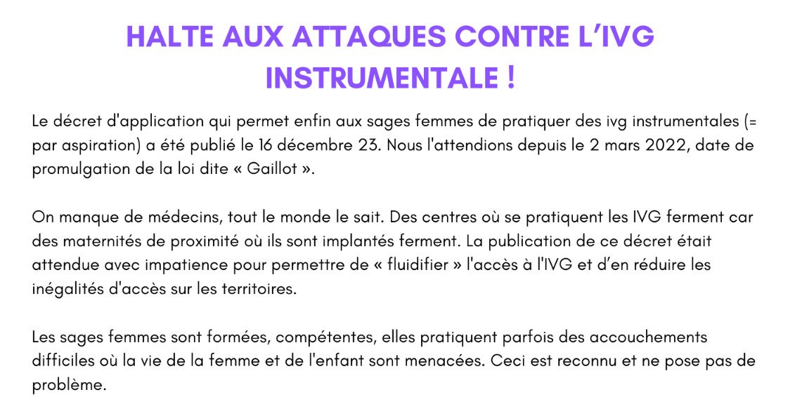 Le décret d'application qui permet enfin aux sages femmes de pratiquer des ivg instrumentales (= par aspiration) a été publié le 16 décembre 23. Nous l'attendions depuis le 2 mars 2022, date de promulgation de la loi dite « Gaillot ». On manque de médecins, tout le monde le sait. Des centres où se pratiquent les IVG ferment car des maternités de proximité où ils sont implantés ferment.