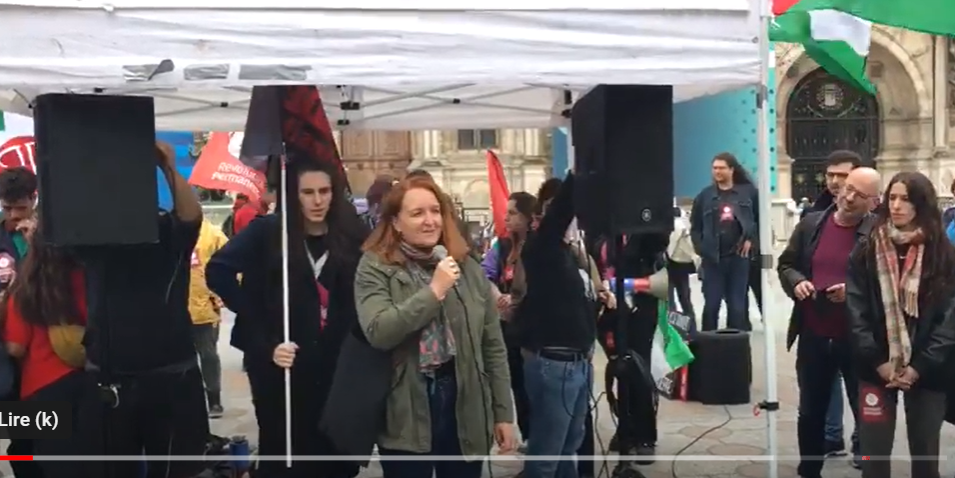 Prise de parole de Murielle Guilbert co-déléguée de l'Union syndicale Solidaires au rassemblement de soutien aux 88 Étudiant-es de la Sorbonne interpellé-es le 8 mai 2024 pour avoir mené des actions de soutien au peuple palestinien, et occupé leur lieu d'étude pour exiger l’arrêt immédiat de la guerre, la fin de la colonisation et de l’apartheid pratiqué par l’État d’Israël.