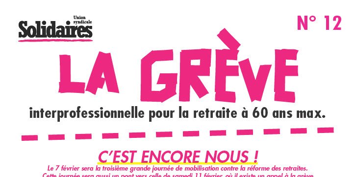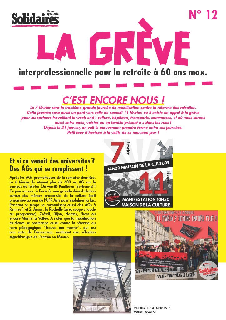 Cette journée sera aussi un pont vers celle de samedi 11 février, où il existe un appel à la grève pour les secteurs travaillant le week-end : culture, hôpitaux, transports, commerces, et où nous serons aussi entre amis, voisins ou en famille présent-e-s dans les rues !