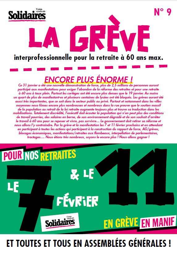 Ce 31 janvier a été une nouvelle démonstration de force, plus de 2,5 millions de personnes auront participé aux manifestations pour exiger l’abandon de la réforme des retraites et pour une retraite à 60 ans à taux plein.