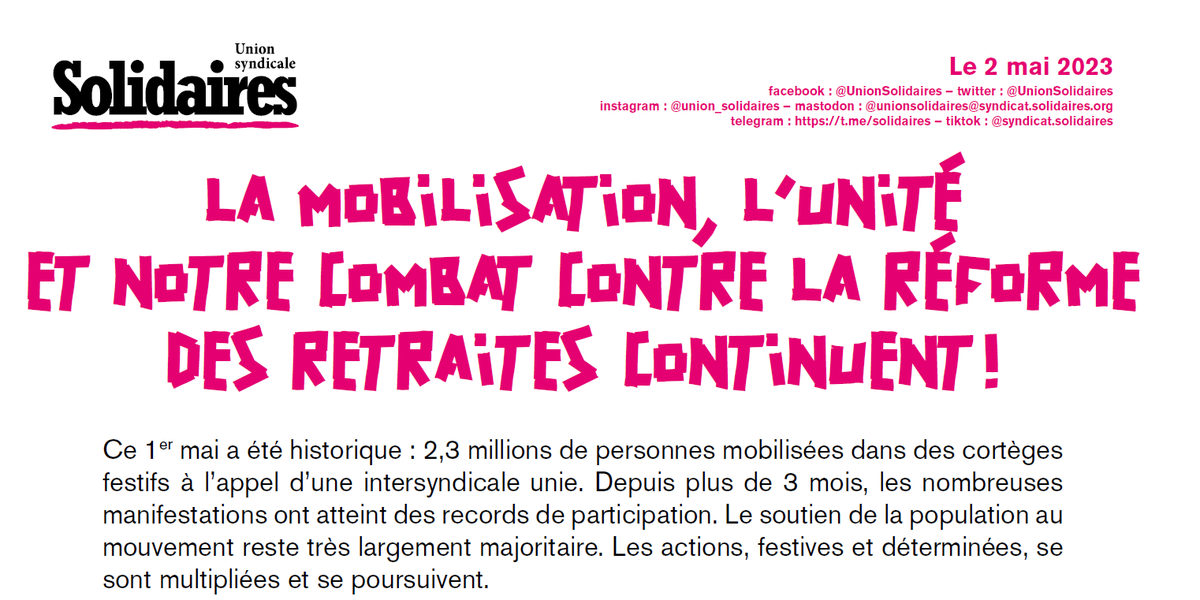 Les prochaines semaines, avec le 6 juin en ligne de mire, seront importantes pour nos combats. Solidaires continuera également à porter les sujets d’urgence majeurs, travaillera à des revendications unitaires, et discutera des meilleures tactiques pour obtenir des avancées concrètes.