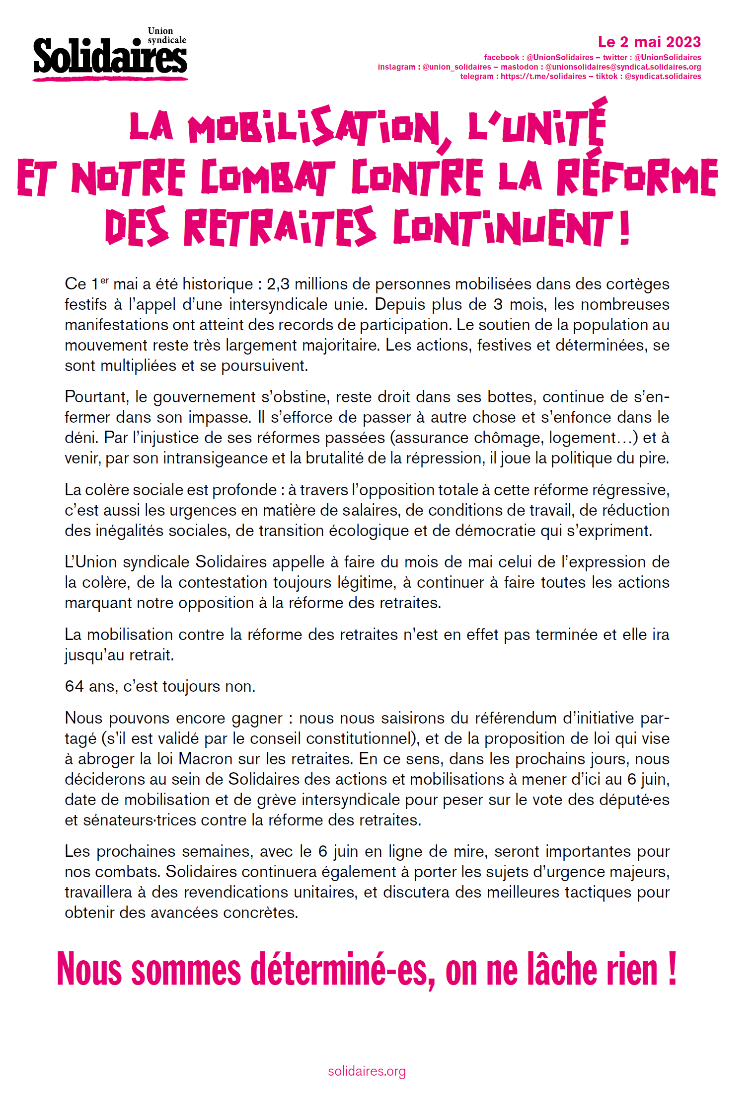 Nous pouvons encore gagner : nous nous saisirons du référendum d’initiative partagé (s’il est validé par le conseil constitutionnel), et de la proposition de loi qui vise à abroger la loi Macron sur les retraites. En ce sens, dans les prochains jours, nous déciderons au sein de Solidaires des actions et mobilisations à mener d’ici au 6 juin, date de mobilisation et de grève intersyndicale pour peser sur le vote des député·es et sénateurs·trices contre la réforme des retraites.