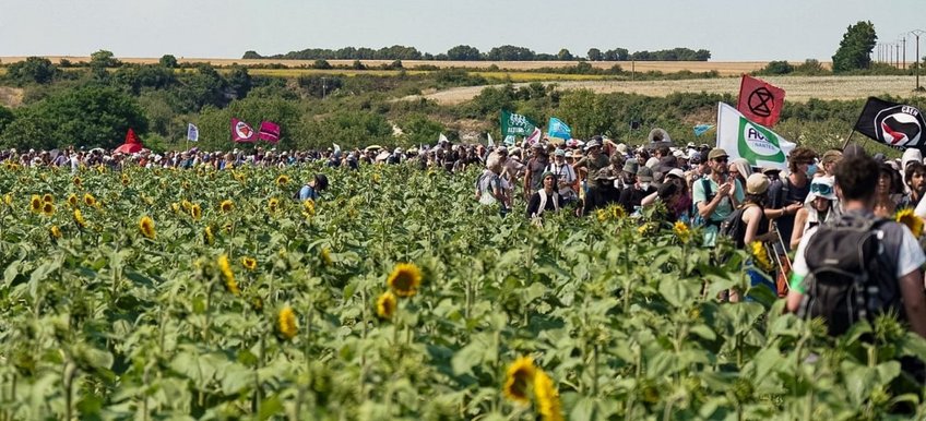 >> Communiqué du 19 juillet 2024 – JOUR DE MANIFESTATION 1 – 10 000 personnes déjouent le blocage policier, marchent sur une coopérative responsable de l’accaparement de l’eau et désarment une méga-bassine avec un dispositif expérimental