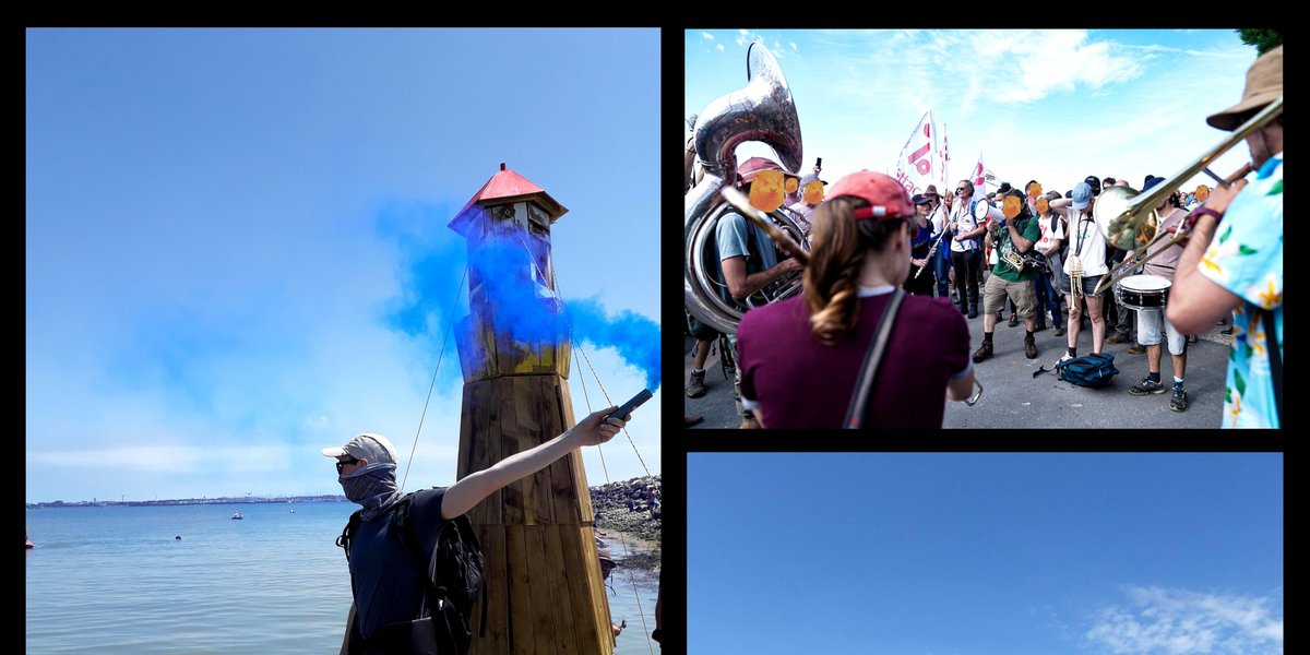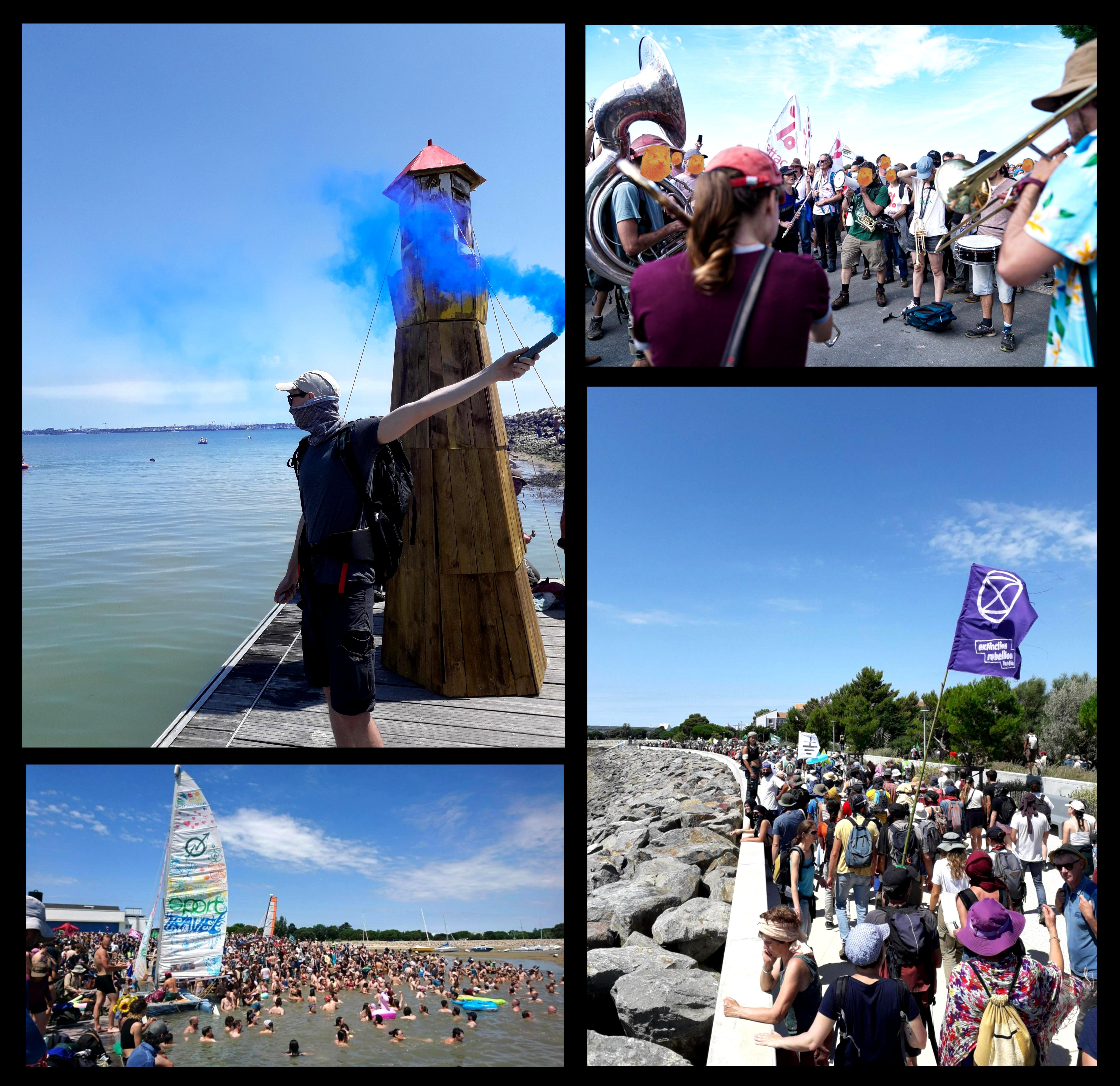 Enfin, samedi, la journée a démarré avec le blocage surprise du port de La Pallice et de l'entreprise de négoce en céréales Soufflet, autre grand promoteur des bassines, par un convoi paysan de tracteurs débarquant depuis le pont de l'île de Ré au nez et à la barbe du dispositif policier. Ce surgissement réussi à marqué une fois de plus l'engagement paysan dans la lutte anti-bassines (leur communiqué ici : https://lessoulevementsdelaterre.org/blog/blocage-surprise-du-port-de-la-rochelle-par-un-convoi ). La mobilisation s'est ensuite poursuivie dans la ville avec plus de 10 000 personnes qui ont progressé vers le port, rejoints par une flottille de catamarans et kayaks. Si les deux cortèges partis en carnaval du centre ville n'ont, quant à eux, pas réussi à aller jusqu'au sein du port du fait du dispositif policier agressif, les activités du terminal agro-industriel ont bien été mises à l'arrêt et les responsables de l'accaparement clairement désignés. Nous y reviendrons tant que ses multinationales détruisent nos vies, nos fermes, nos bassins versants et ceux des populations de l'autre côté de l'océan. La journée a fini par un bain collectif mythique en farandole sur une plage de La Rochelle et par une grande fête finale au village de l'eau.