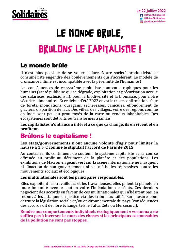 Les conséquences de ce système capitaliste sont catastrophiques pour les humains (santé publique qui se dégrade, exploitation et précarisation accrue des salarié.es, exclusions…), pour la biodiversité et la biomasse, pour notre sécurité alimentaire... Et ce début d’été 2022 en est la triste confirmation : feux de forêts, inondations, ouragans, sécheresses, canicules, effondrement de glaciers, disparition de lacs. Des villes, des villages, voire des régions comme en Inde, sont peu ou prou rayés de la carte ou rendus inhabitables. Des écosystèmes sont détruits ou transformés à jamais.