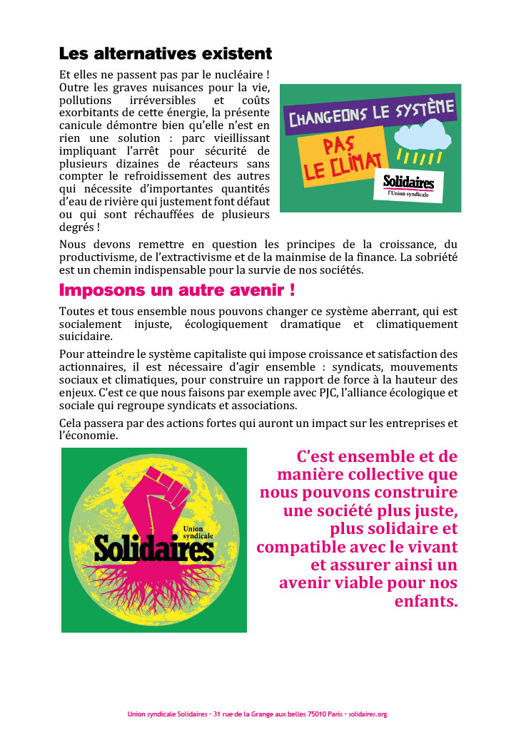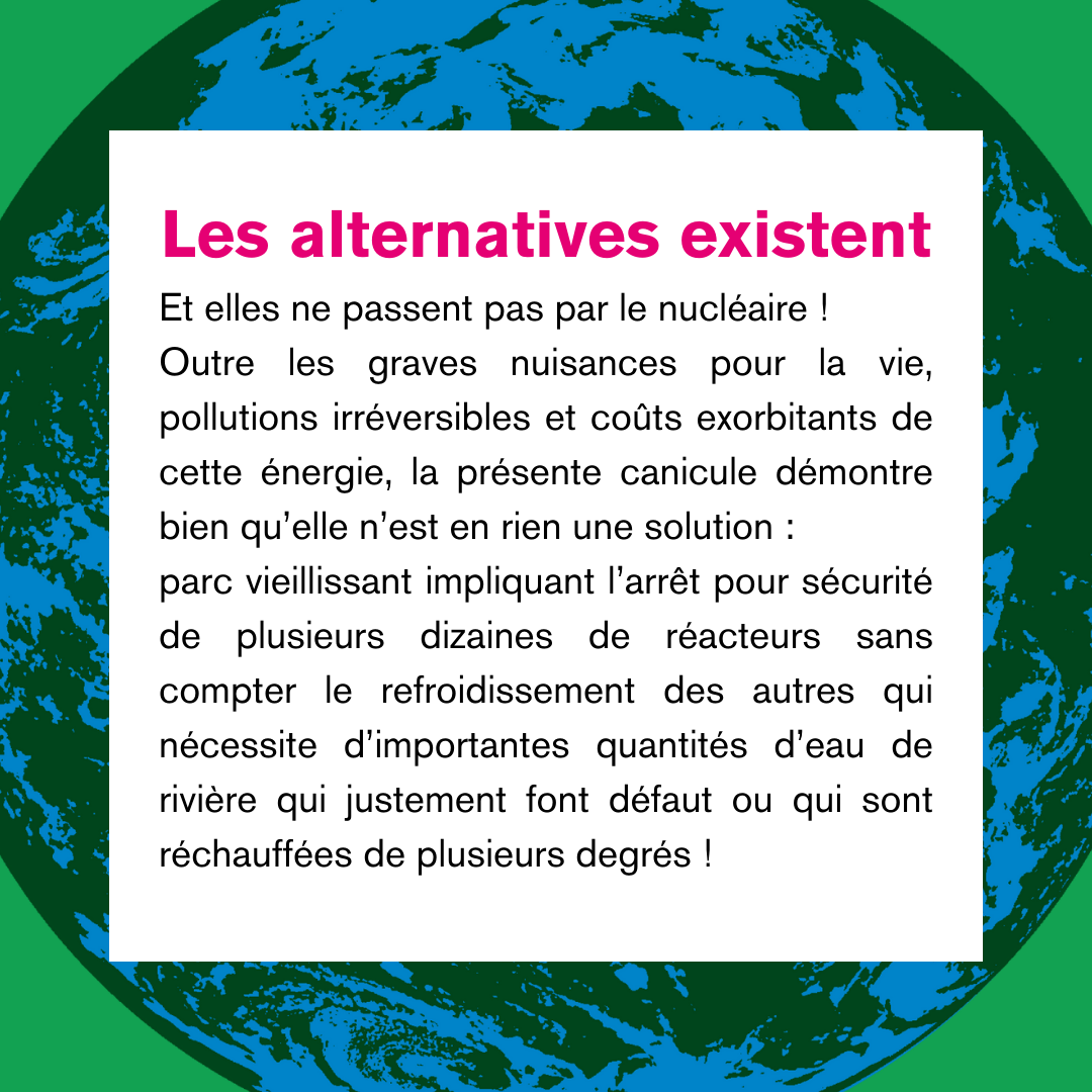 Et elles ne passent pas par le nucléaire ! Outre les graves nuisances pour la vie, pollutions irréversibles et coûts exorbitants de cette énergie, la présente canicule démontre bien qu’elle n’est en rien une solution : parc vieillissant impliquant l’arrêt pour sécurité de plusieurs dizaines de réacteurs sans compter le refroidissement des autres qui nécessite d’importantes quantités d’eau de rivière qui justement font défaut ou qui sont réchauffées de plusieurs degrés !