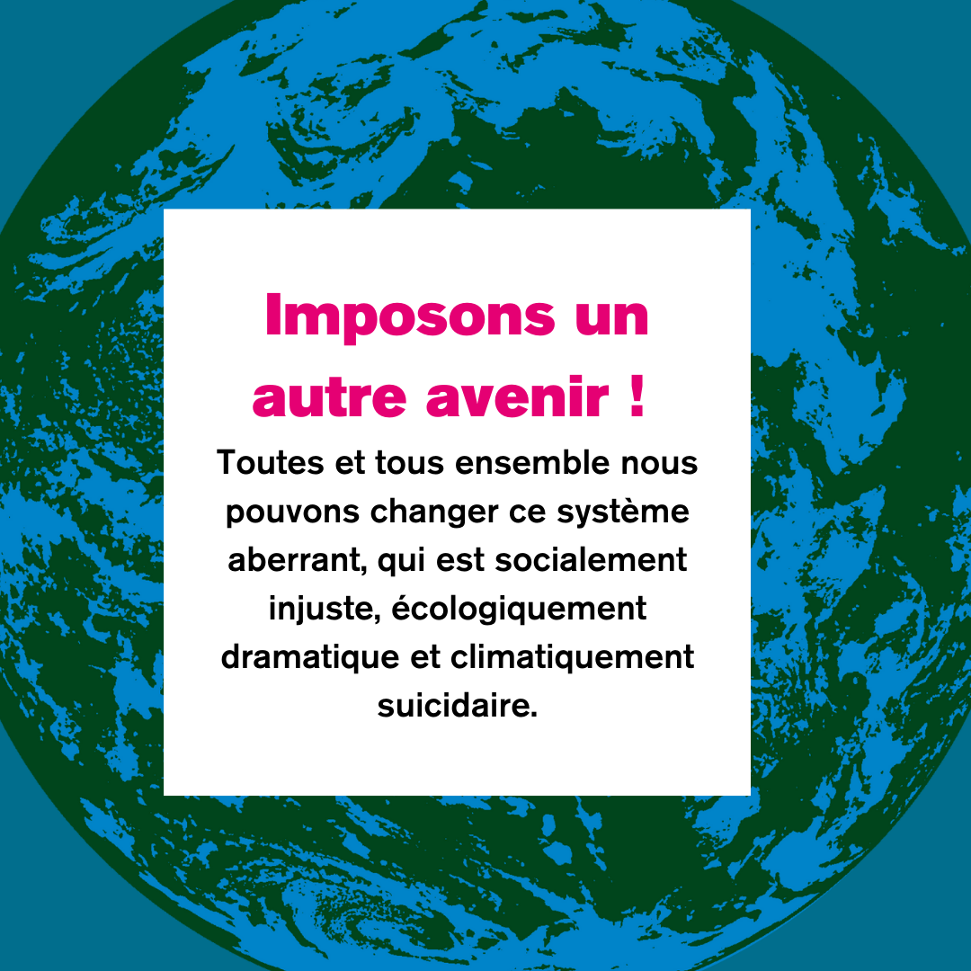 Toutes et tous ensemble nous pouvons changer ce système aberrant, qui est socialement injuste, écologiquement dramatique et climatiquement suicidaire.