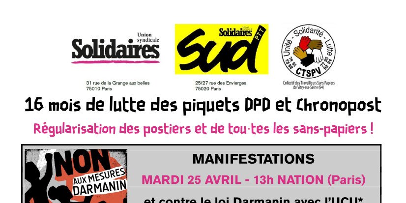 Mobilisations pour la régularisation des postiers et de tou⋅tes les sans-papiers ! 16 mois de lutte des piquets DPD et Chronopost -