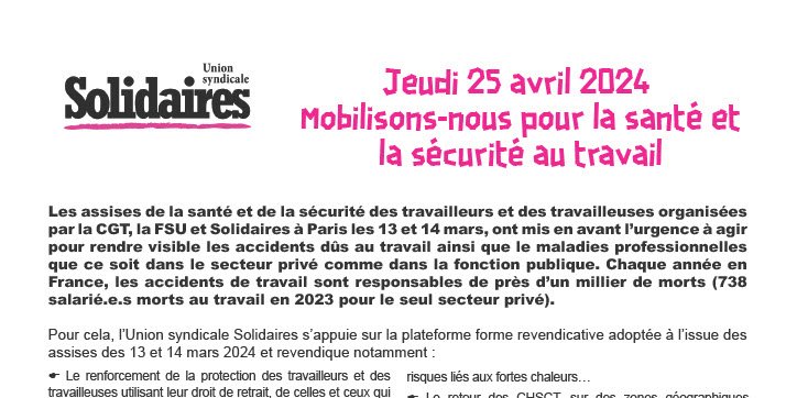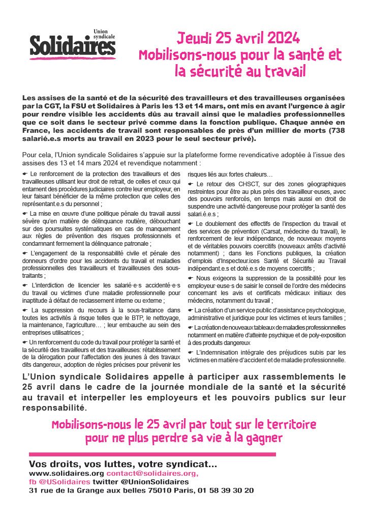 L’Union syndicale Solidaires appelle à participer aux rassemblements le 25 avril dans le cadre de la journée mondiale de la santé et la sécurité au travail et interpeller les employeurs et les pouvoirs publics sur leur responsabilité.
