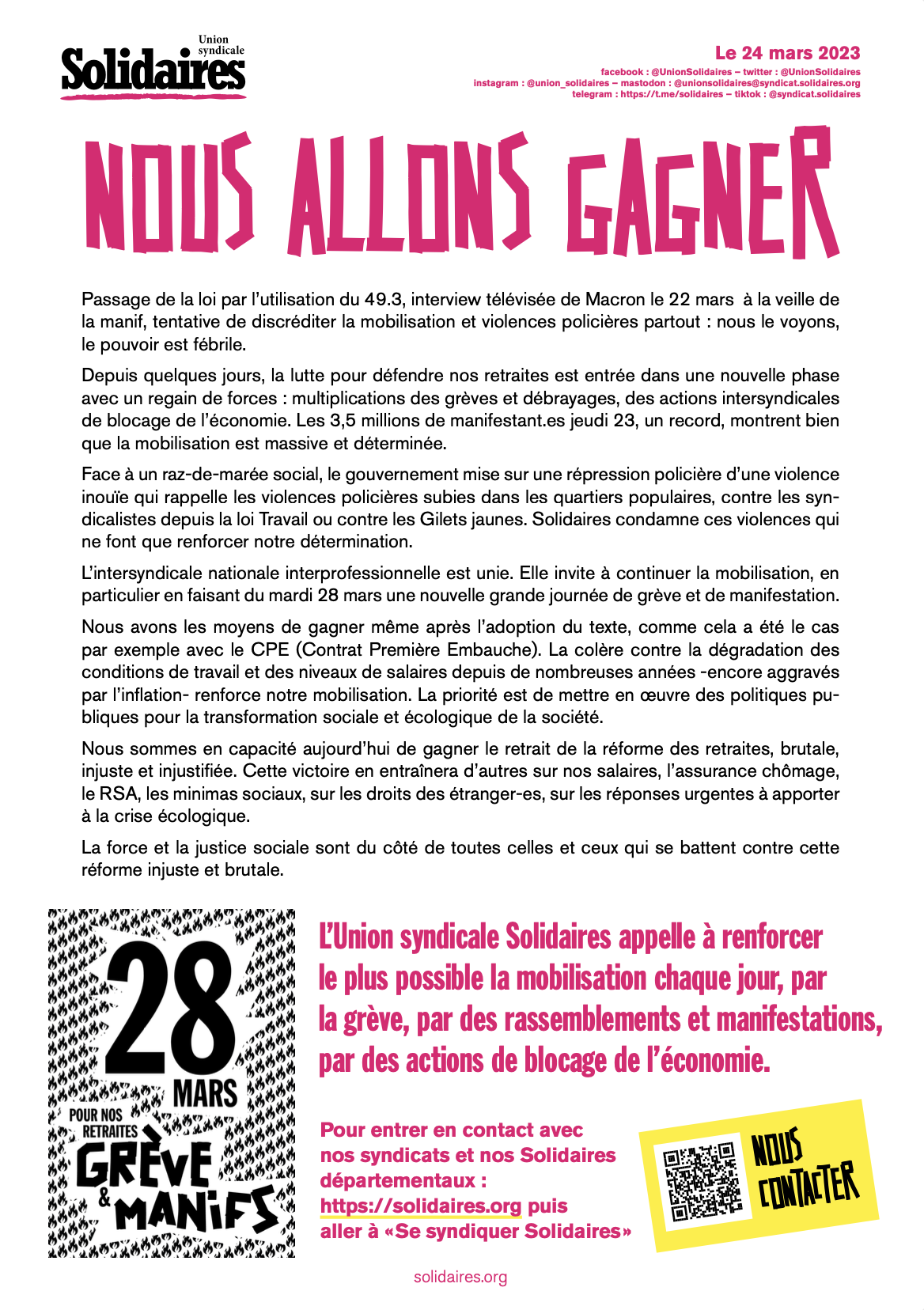 Passage de la loi par l’utilisation du 49.3, interview télévisée de Macron le 22 mars à la veille de la manif, tentative de discréditer la mobilisation et violences policières partout : nous le voyons, le pouvoir est fébrile.