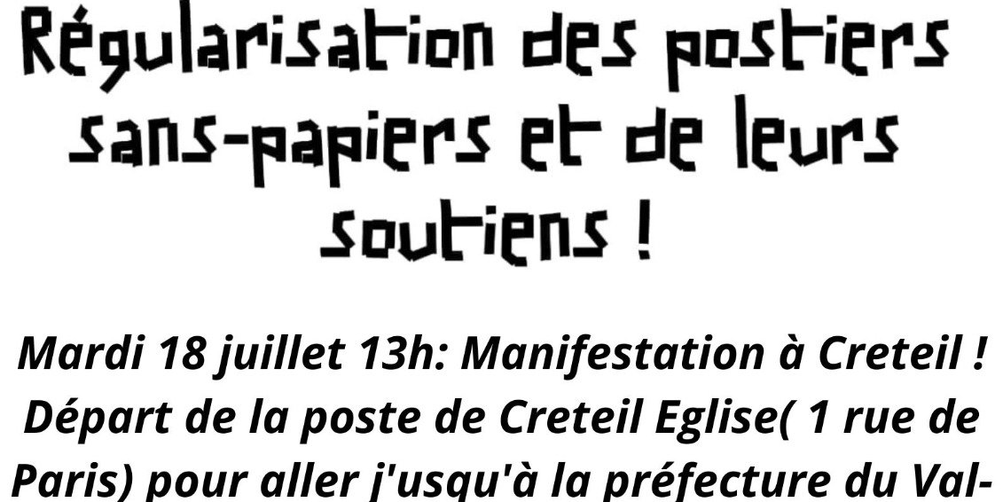 Régularisation de tous les occupants du piquet des travailleurs sans-papiers de Chronopost Alfortville ! Manifestation Mardi 18 juillet, 13H, de La Poste Créteil .