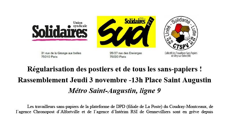 Le comble du cynisme, c’est que La Poste prétend s’en sortir en ayant rompu ses contrats avec Derichebourg, remplacé depuis juillet par d’autres sous-traitants dans les 2 agences en lutte (DPD Coudray- Montceau et Chronopost Alfortville). De ce fait, elle croit se laver les mains du sort des travailleurs sans-papiers laissés sur le carreau par cette manœuvre peu glorieuse.