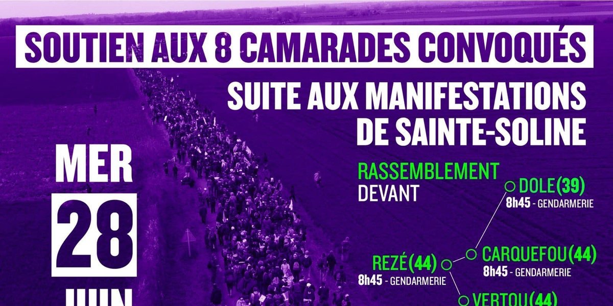 Le 28 juin prochain, au moins huit camarades impliqués dans le mouvement d'opposition aux méga-bassines sont convoqués par la gendarmerie au motif qu'ils auraient organisé l'une ou l'autre des deux grandes manifestations à Sainte-Soline.