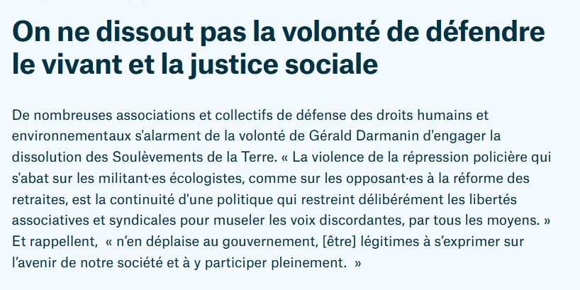 Tribune de solidarité avec les Mouvements de la Terre menacés de dissolution, publiée par Médiapart : https://blogs.mediapart.fr/les-invites-de-mediapart/blog/040423/ne-dissout-pas-la-volonte-de-defendre-le-vivant-et-la-justice-sociale