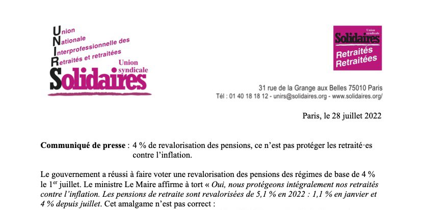 Le gouvernement a réussi à faire voter une revalorisation des pensions des régimes de base de 4 % le 1er juillet. Le ministre Le Maire affirme à tort « Oui, nous protégeons intégralement nos retraités contre l’inflation. Les pensions de retraite sont revalorisées de 5,1 % en 2022 : 1,1 % en janvier et 4 % depuis juillet. Cet amalgame n’est pas correct :