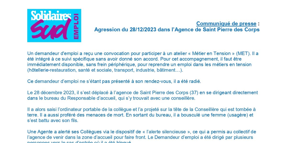 Agression du 28/12/2023 dans l’Agence de Saint Pierre des Corps