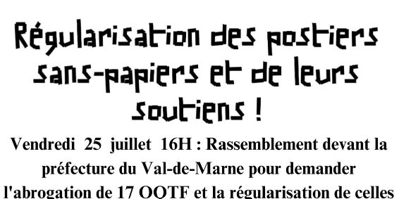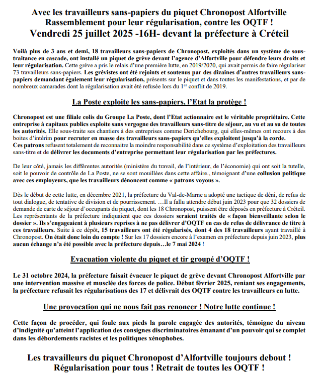 Avec les travailleurs sans-papiers du piquet Chronopost Alfortville Rassemblement pour leur régularisation, contre les OQTF ! Vendredi 25 juillet 2025 -16H- devant la préfecture à Créteil