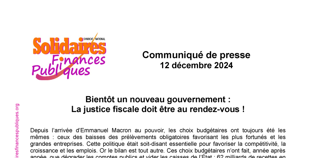 Pour Solidaires Finances Publiques, il est urgent que la justice fiscale, sociale et environnementale soit réellement au cœur des choix politiques !