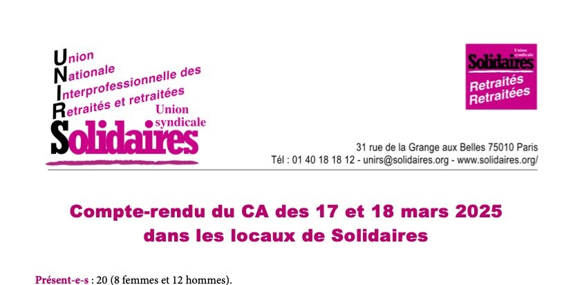 Il s’agit de désigner un Secrétariat / Bureau parmi les membres élus au C.A. par l’A.G. du 28 janvier 2025. Ce secrétariat comme ce C.A. fonctionneront jusqu’à la prochaine AG de l’UNIRS fixée au mercredi 10 décembre 2025, sachant que toute modification est possible en cours d’année. Il faudrait prévoir un ou une camarade pour la trésorerie, avec Carine.