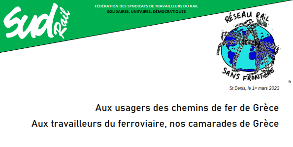Au nom de la fédération syndicale française SUD-Rail [Solidaires], nous tenons à exprimer nos condoléances après le déraillement de deux trains à proximité de Larissa (Grèce).