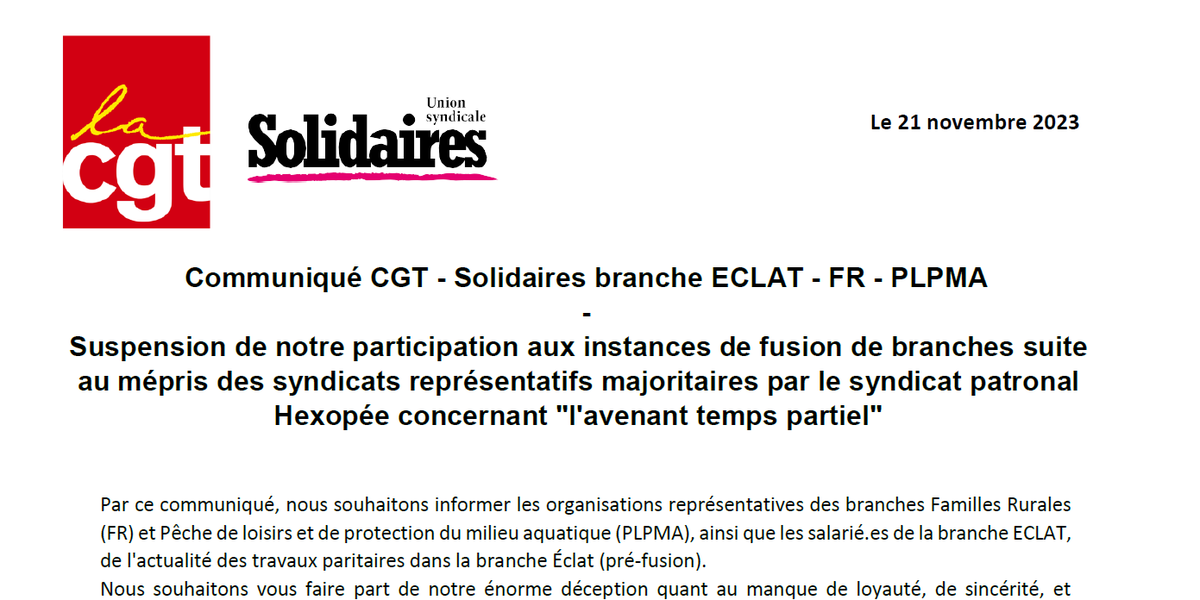 Communiqué CGT-Solidaires branche ECLAT–FR–PLPMA : Suspension de notre participation aux instances de fusion de branches