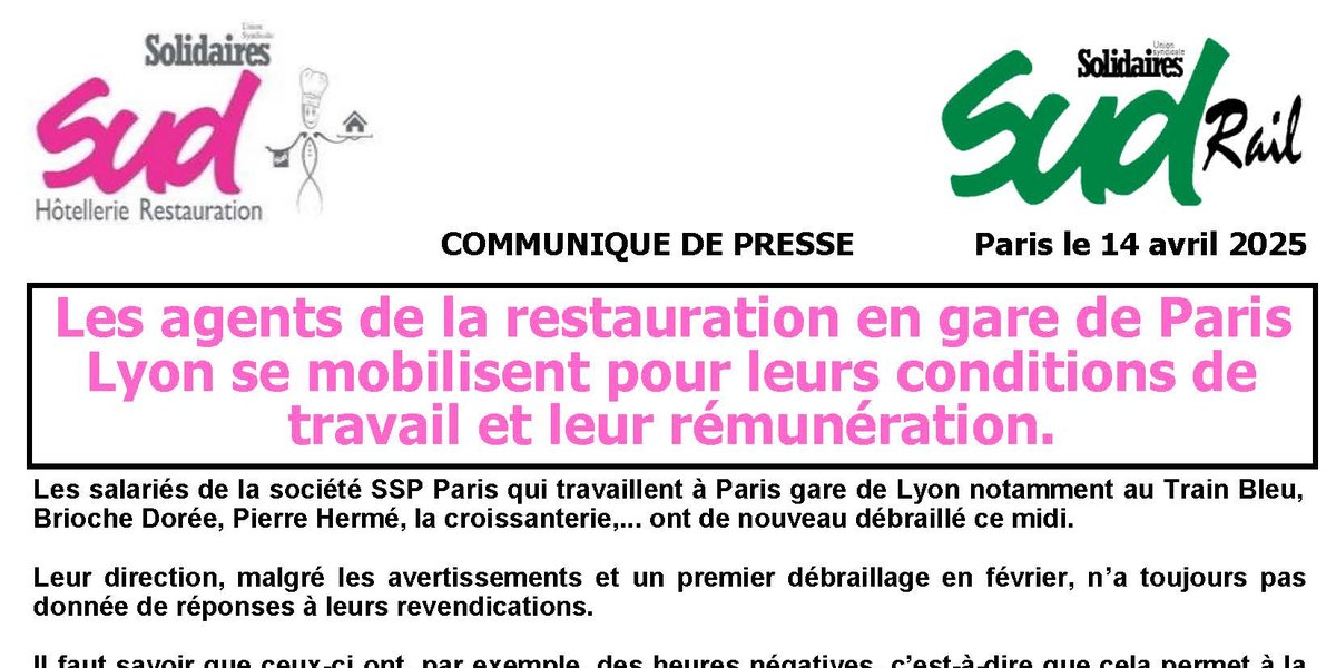 SUD Hôtellerie/restauration et SUD-Rail se trouvent aux cotés des salariés en lutte face à un patron qui ne les écoute pas. Des salariés qui sont mal payés et qui travaillent dans des conditions difficiles, car une gare, c’est un environnement bruyant et complexe, des services rapides et une exigence qui est donc particulière.