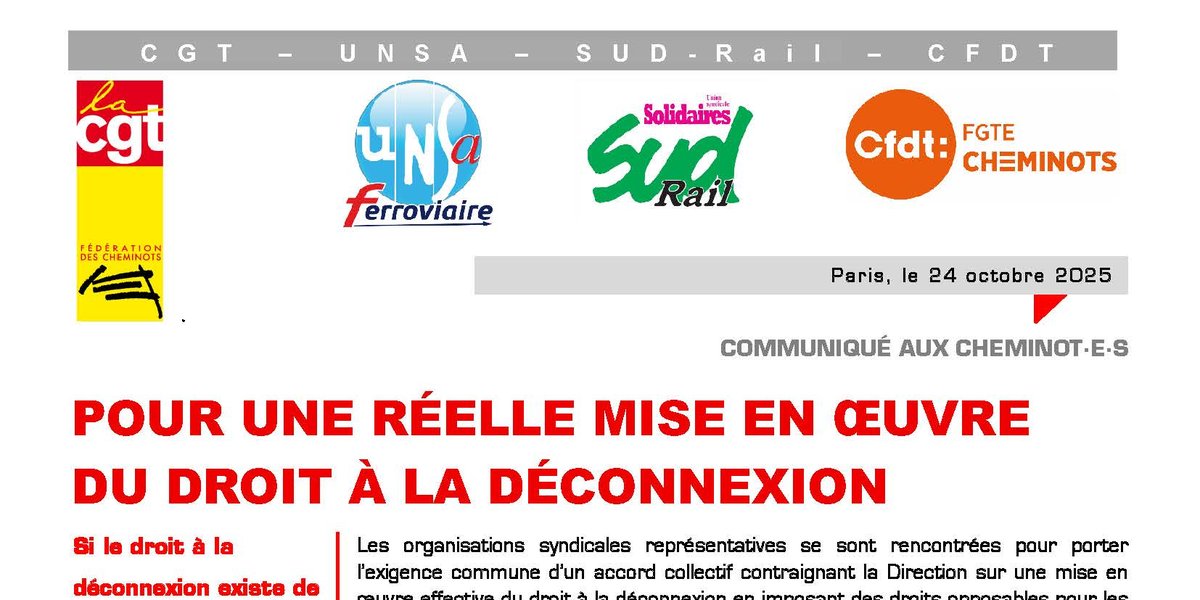 Les organisations syndicales CGT Cheminots, UNSA Ferroviaire, SUD-Rail et CFDT Cheminots s’engagent à défendre cette plateforme revendicative unitaire dans les différentes réunions à venir dans le cadre de la négociation. Pour garantir les droits des cheminot·e·s., alléger leur charge mentale et préserver leur santé.