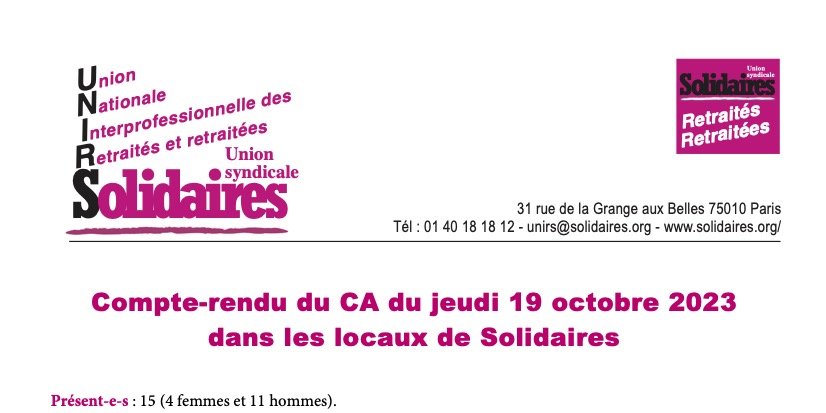 - Le PLFSS 2024. En document préparatoire à nos discussions, a été joint le texte rédigé par Alain Caillot, ancien de SUD Protection sociale, actuellement à Solidaires 76. Ce texte a été vu par la commission « Protection sociale » de Solidaires et a été retenu par le secrétariat national de Solidaires pour rédiger le communiqué de Solidaires du 9 octobre.