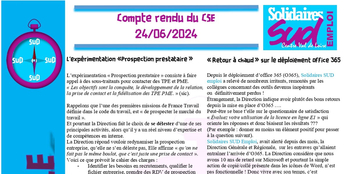 Compte rendu du CSE du 24/06/2024 - France Travail Région Centre