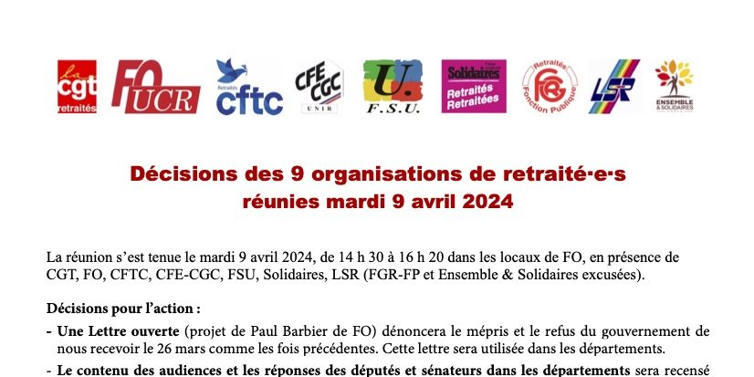 Décisions des 9 organisations de retraité·e·s le 9 avril 24