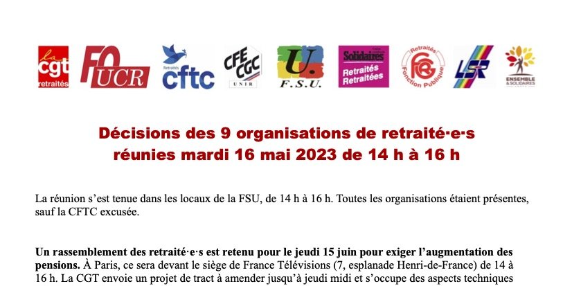 Décisions des 9 organisations de retraité·e·s réunies mardi 16 mai 2023 et, en autre pièce jointe, le compte-rendu complet de cette réunion.