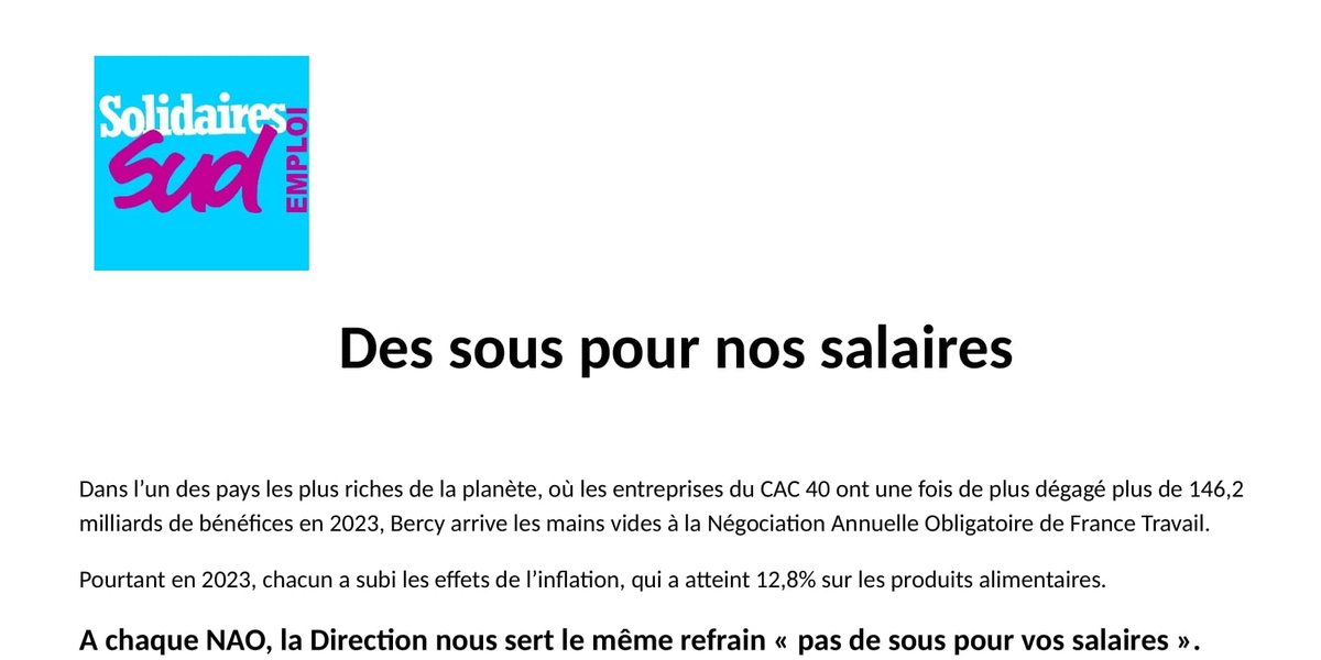 milliards de bénéfices en 2023, Bercy arrive les mains vides à la Négocia􀆟on Annuelle Obligatoire de France Travail.
