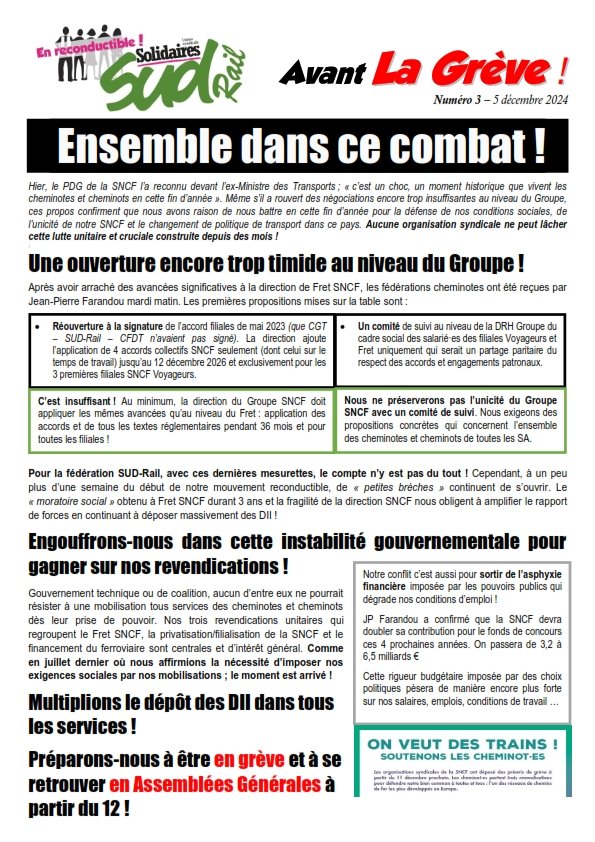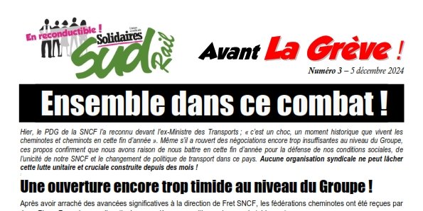 Hier, le PDG de la SNCF l’a reconnu devant l’ex-Ministre des Transports ; « c’est un choc, un moment historique que vivent les cheminotes et cheminots en cette fin d’année ». Même s’il a rouvert des négociations encore trop insuffisantes au niveau du Groupe, ces propos confirment que nous avons raison de nous battre en cette fin d’année pour la défense de nos conditions sociales, de l’unicité de notre SNCF et le changement de politique de transport dans ce pays. Aucune organisation syndicale ne peut lâcher cette lutte unitaire et cruciale construite depuis des mois !