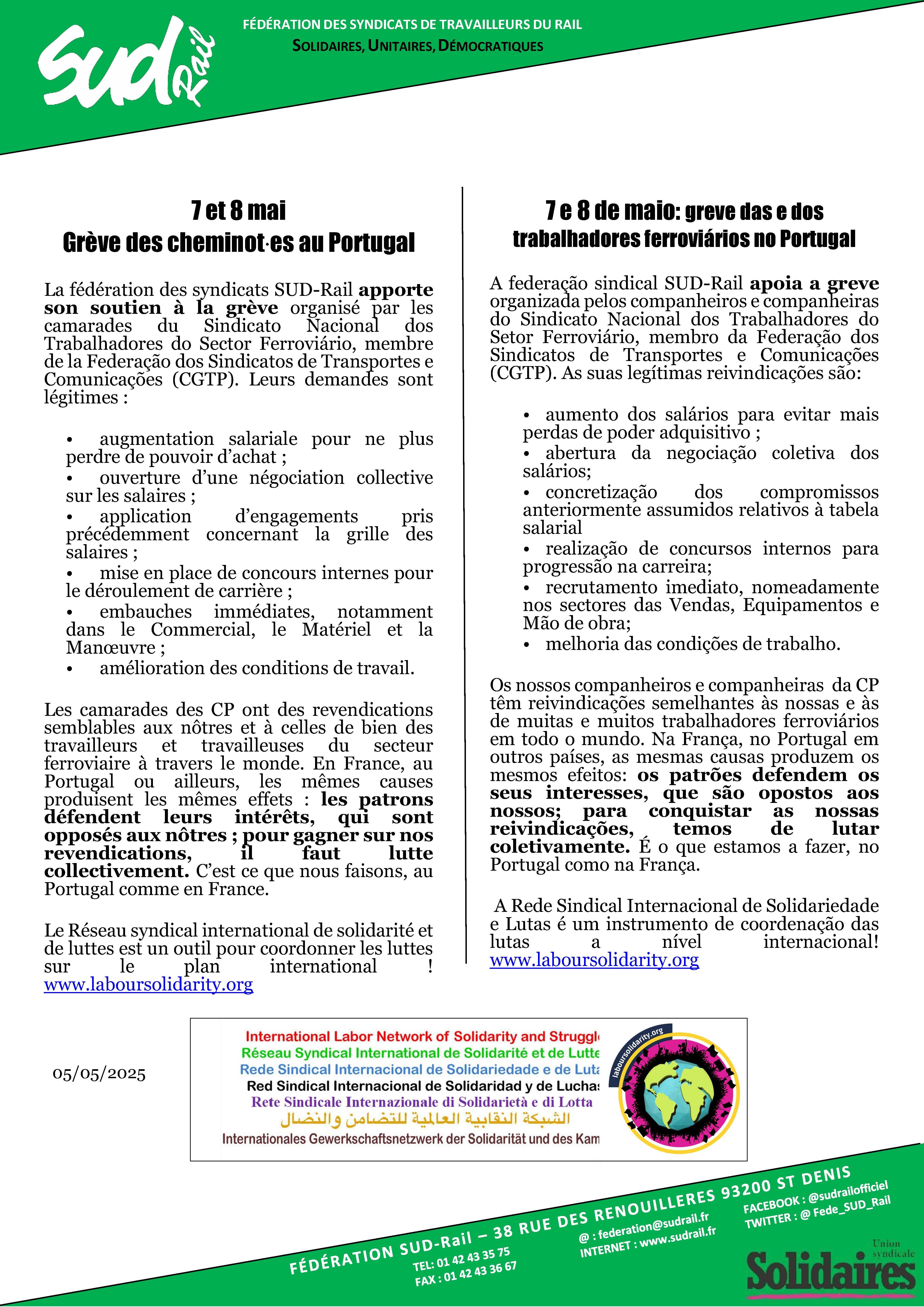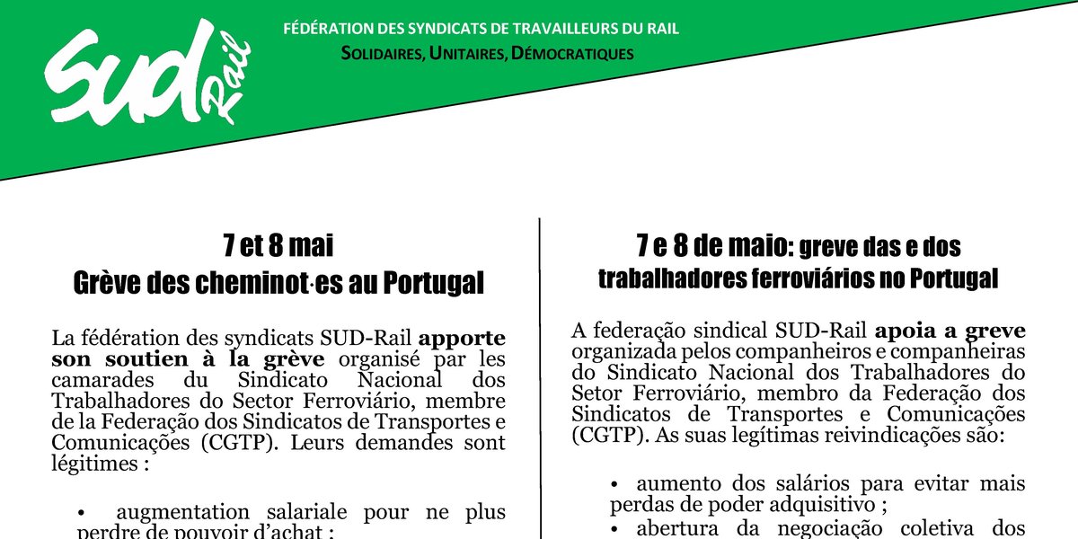 La fédération des syndicats SUD-Rail apporte son soutien à la grève organisé par les camarades du Sindicato Nacional dos Trabalhadores do Sector Ferroviário, membre de la Federação dos Sindicatos de Transportes e Comunicações (CGTP).
