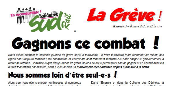 Nous allons entamer la huitième journée de grève dans le ferroviaire. Le trafic ferroviaire reste fortement au ralenti, des lignes sont toujours fermées ; les cheminotes et cheminots sont fortement mobilisé-e-s pour obliger le gouvernement à retirer sa réforme. Convaincus que des journées de grève isolées ne nous permettront pas de gagner et en accord avec les autres fédérations cheminotes, nous avons débuté un mouvement reconductible depuis lundi soir à la SNCF