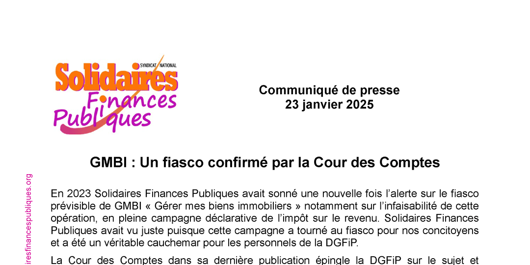 En 2023 Solidaires Finances Publiques avait sonné une nouvelle fois l’alerte sur le fiasco prévisible de GMBI « Gérer mes biens immobiliers » notamment sur l’infaisabilité de cette opération, en pleine campagne déclarative de l’impôt sur le revenu. Solidaires Finances Publiques avait vu juste puisque cette campagne a tourné au fiasco pour nos concitoyens et a été un véritable cauchemar pour les personnels de la DGFiP.