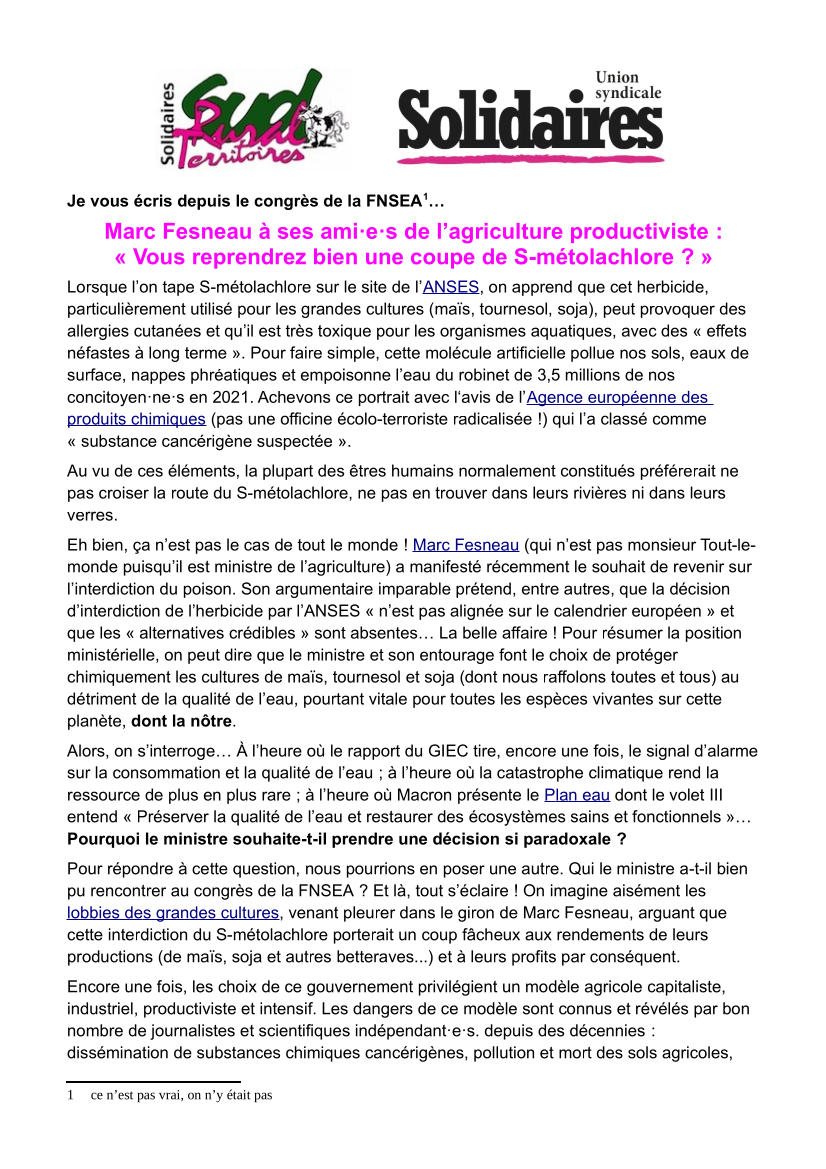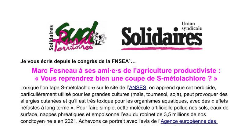 Pour répondre à cette question, nous pourrions en poser une autre. Qui le ministre a-t-il bien pu rencontrer au congrès de la FNSEA ? Et là, tout s’éclaire ! On imagine aisément les lobbies des grandes cultures, venant pleurer dans le giron de Marc Fesneau, arguant que cette interdiction du S-métolachlore porterait un coup fâcheux aux rendements de leurs productions (de maïs, soja et autres betteraves…) et à leurs profits par conséquent.