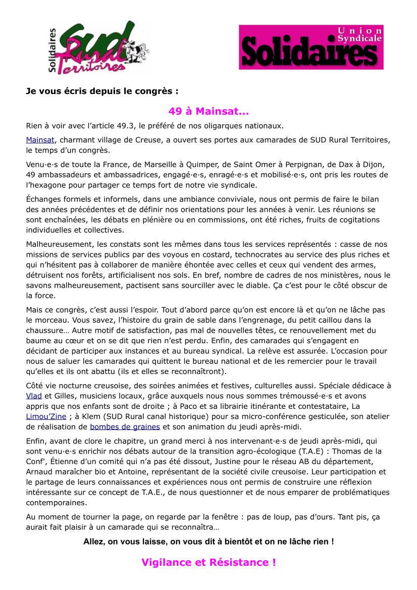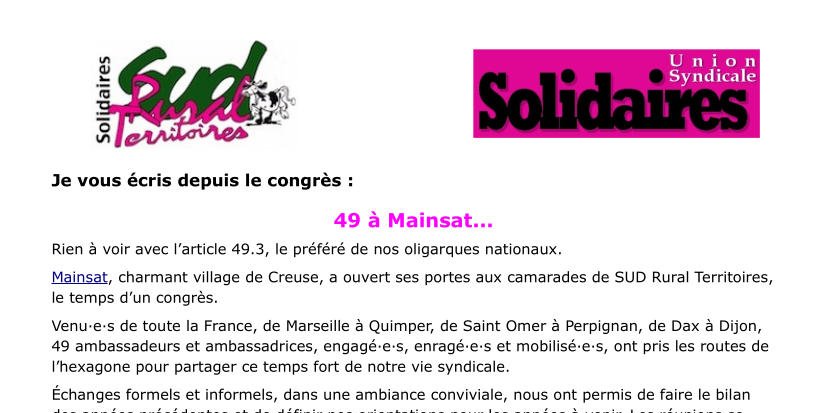 Mainsat, charmant village de Creuse, a ouvert ses portes aux camarades de SUD Rural Territoires, le temps d’un congrès.