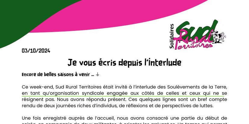 Le week-end des 21 et 22 septembre, SUD Rural Territoires était invité à l’interlude des Soulèvements de la Terre, en tant qu’organisation syndicale engagée aux côtés de celles et ceux qui ne se résignent pas. Nous avons répondu présent. Ces quelques lignes sont un bref compte rendu de deux journées riches d’individus, de réflexions et de perspectives de luttes.